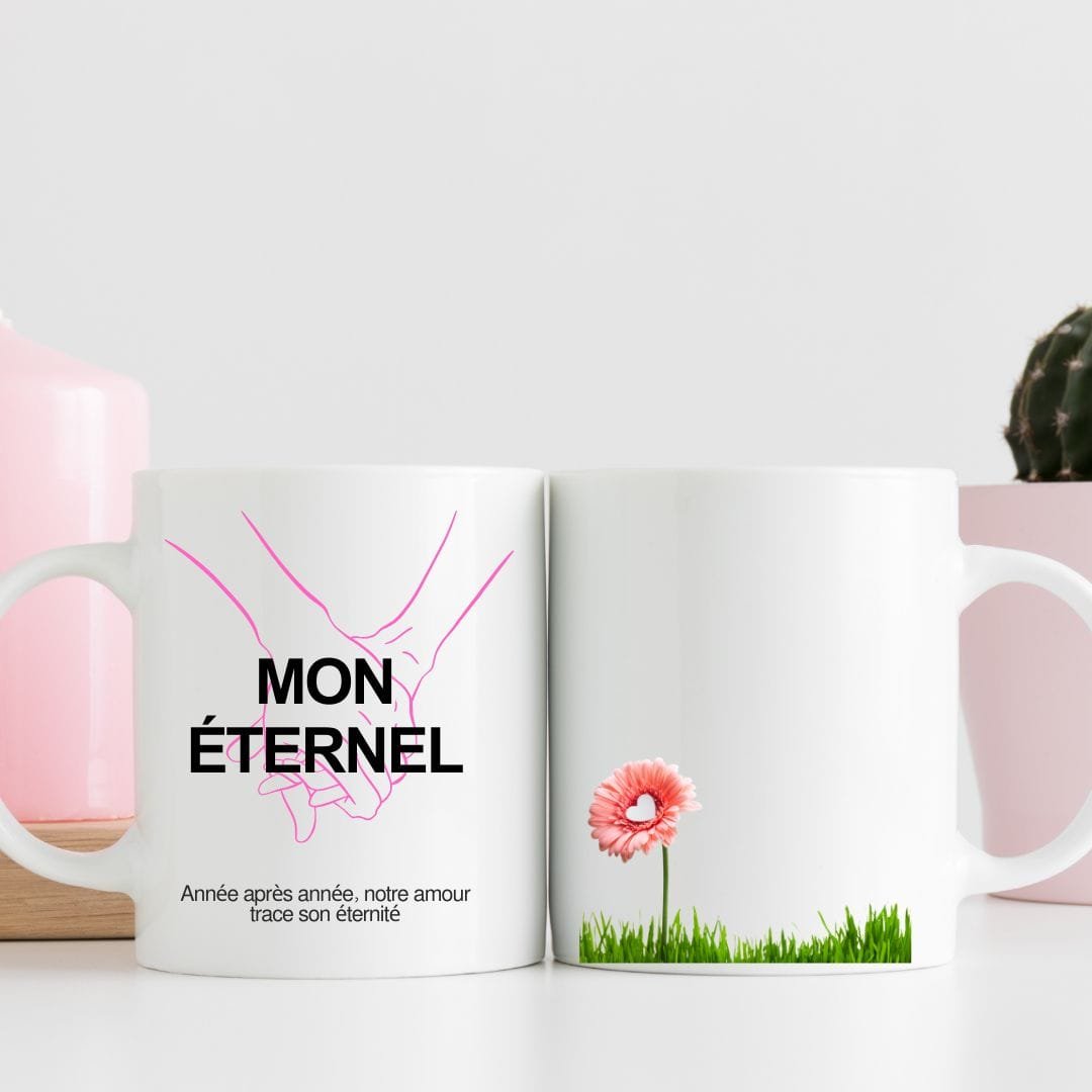 Célébrez votre amour intemporel avec ce mug en céramique raffiné, illustré de deux mains entrelacées symbolisant l’unité et la complicité des amoureux. Le message « Mon éternel, année après année, notre amour trace son éternité » capture la beauté et la force d’un amour qui résiste au temps.